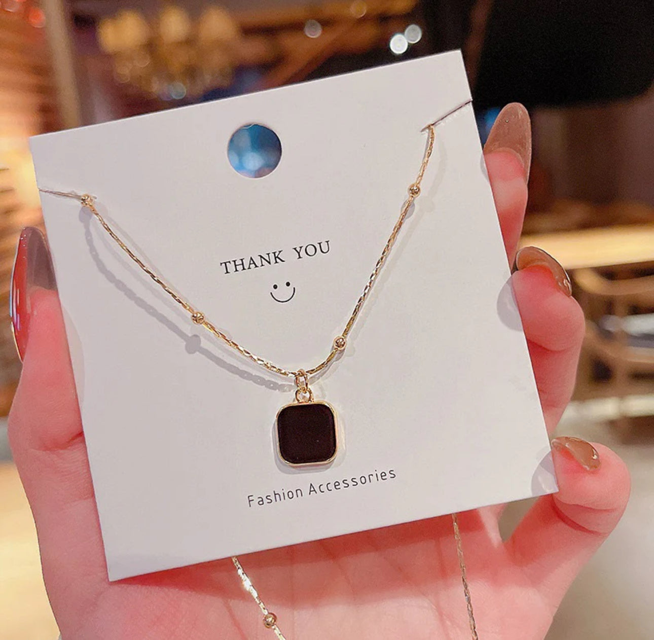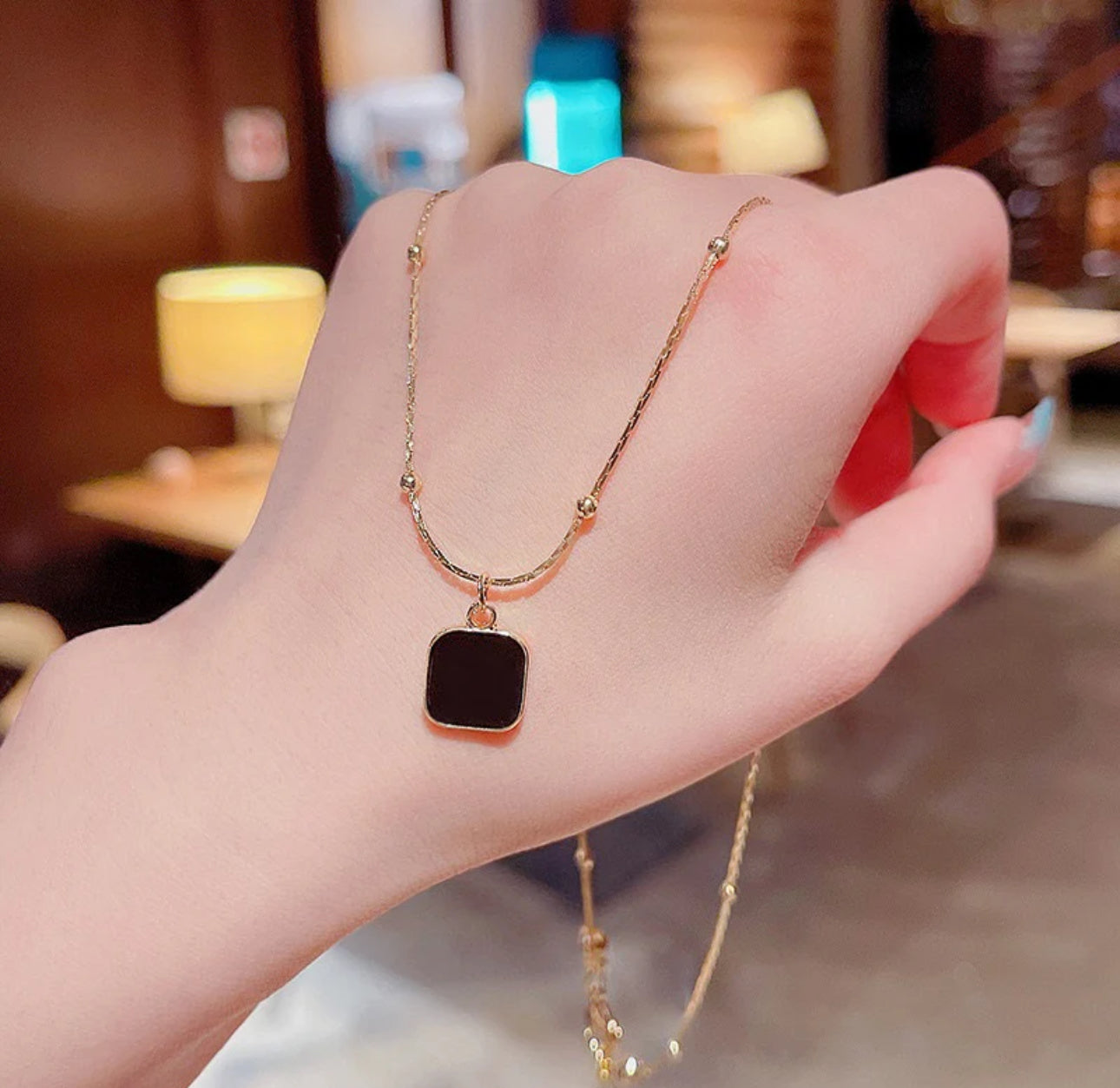 Refine your look with the Samora Black Charm Minimal Necklace. Featuring a polished black square charm set in a sleek gold-tone frame and chain, this minimalist piece adds a modern edge to any outfit. Ideal for layering or wearing solo, it’s a versatile must-have for your accessory collection.