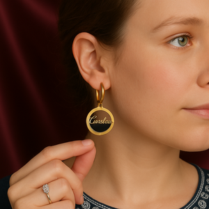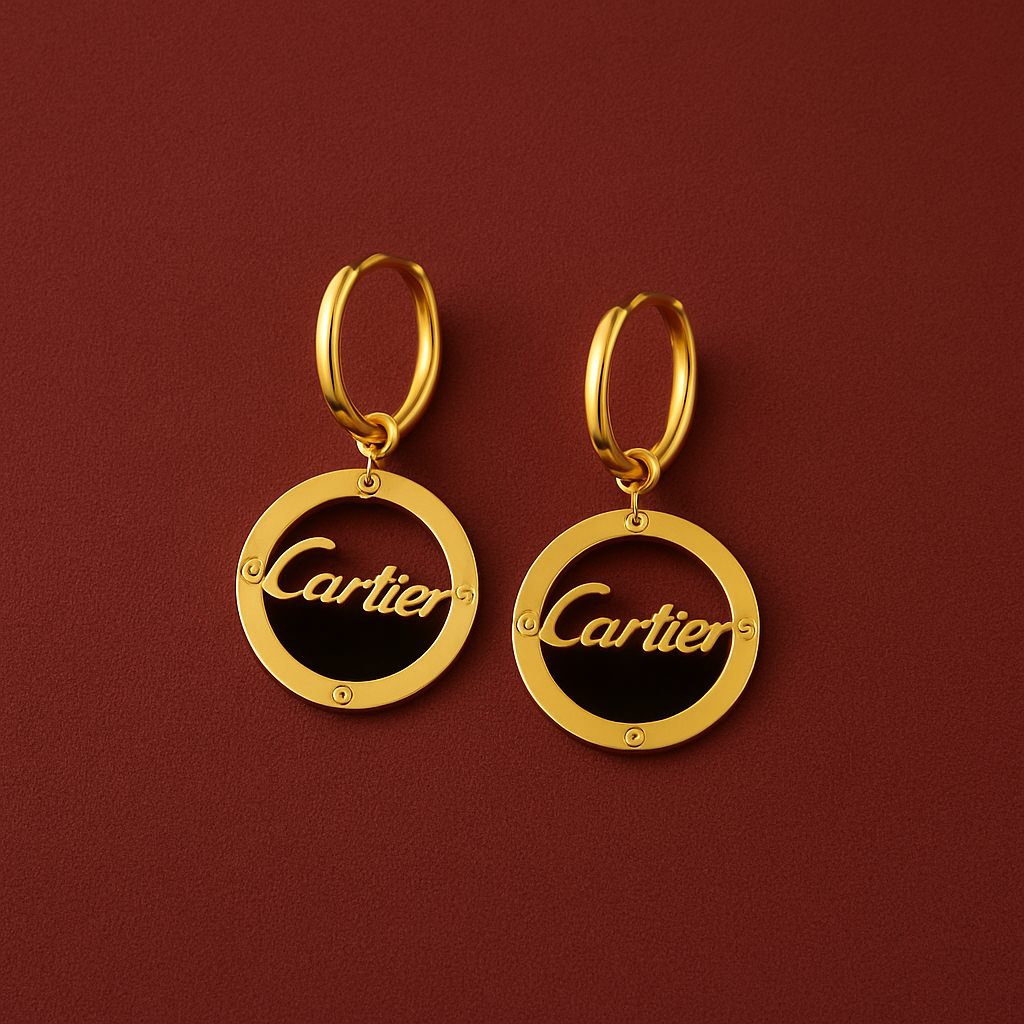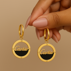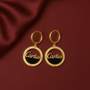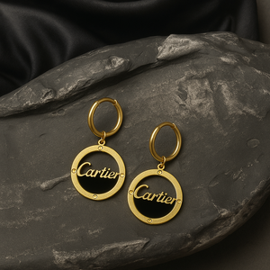 Elevate your style with cartier by samora. These fashion-forward earrings feature a bold gold circular design with the iconic Cartier-style script, crafted to make a statement. Whether you're dressing up for an event or adding flair to everyday wear, this piece embodies elegance and strength.