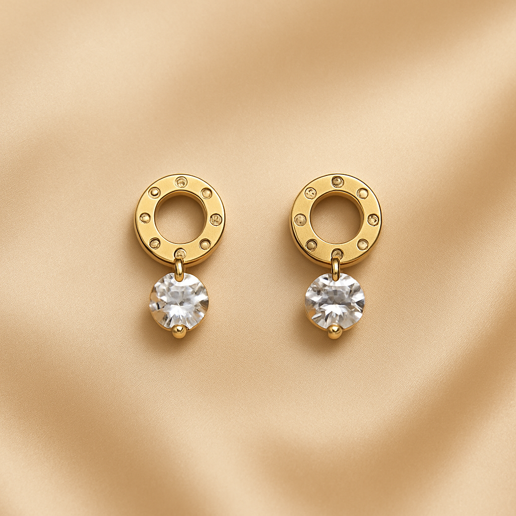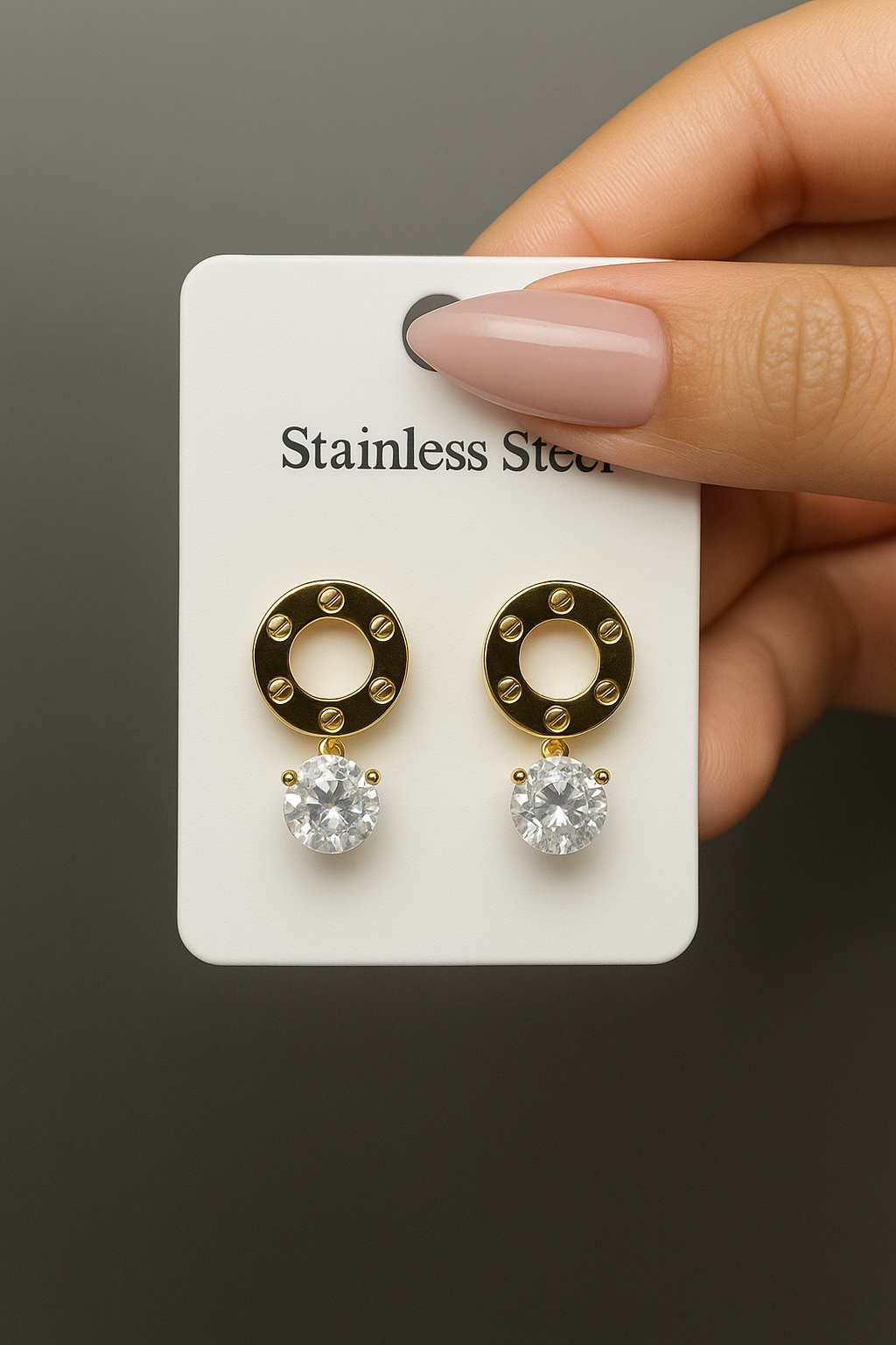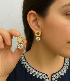 Elevate your style with our Golden Ring Drop Tops. A fusion of glam and charm, these gold-toned tops with clear stone drops are carefully designed in Pakistan. Lightweight and eye-catching, they enhance both modern and traditional outfits effortlessly.