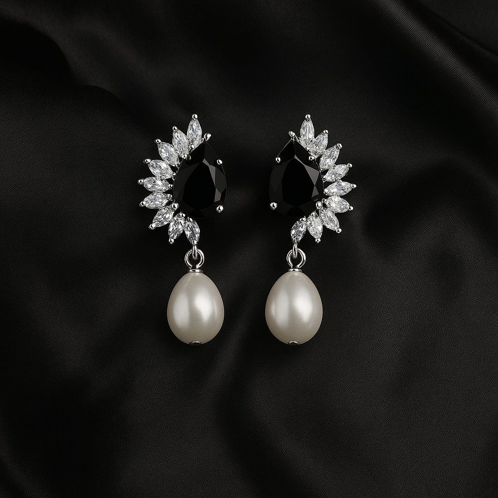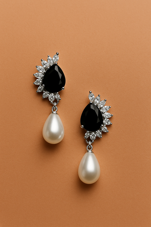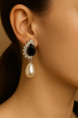 Showcase timeless elegance with Pearl Drop earing from Samora. Featuring imitation pearl drops paired with black stones and sparkling accents, these earrings are perfect for evening wear and special occasions. A refined and classy accessory to elevate your style.
